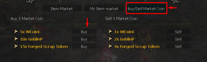 ![]() | First click on Destiny Marketplace NPC . Then go to Buy/Sell Market Coin and you can choose 3 different ways to buy/sell Market Coins . Buy Market Coins: 5 WCoins = 1 Market Coin 10 GoblinP = 1 Market Coin 15 Forged Scrap Tokens = 1 Market Coin Sell Market Coins: 1 Market Coin = 1 Wcoin 1 Market Coin = 2 Goblin Points 1 Market Coin = 4 Forged Scrap Tokens |